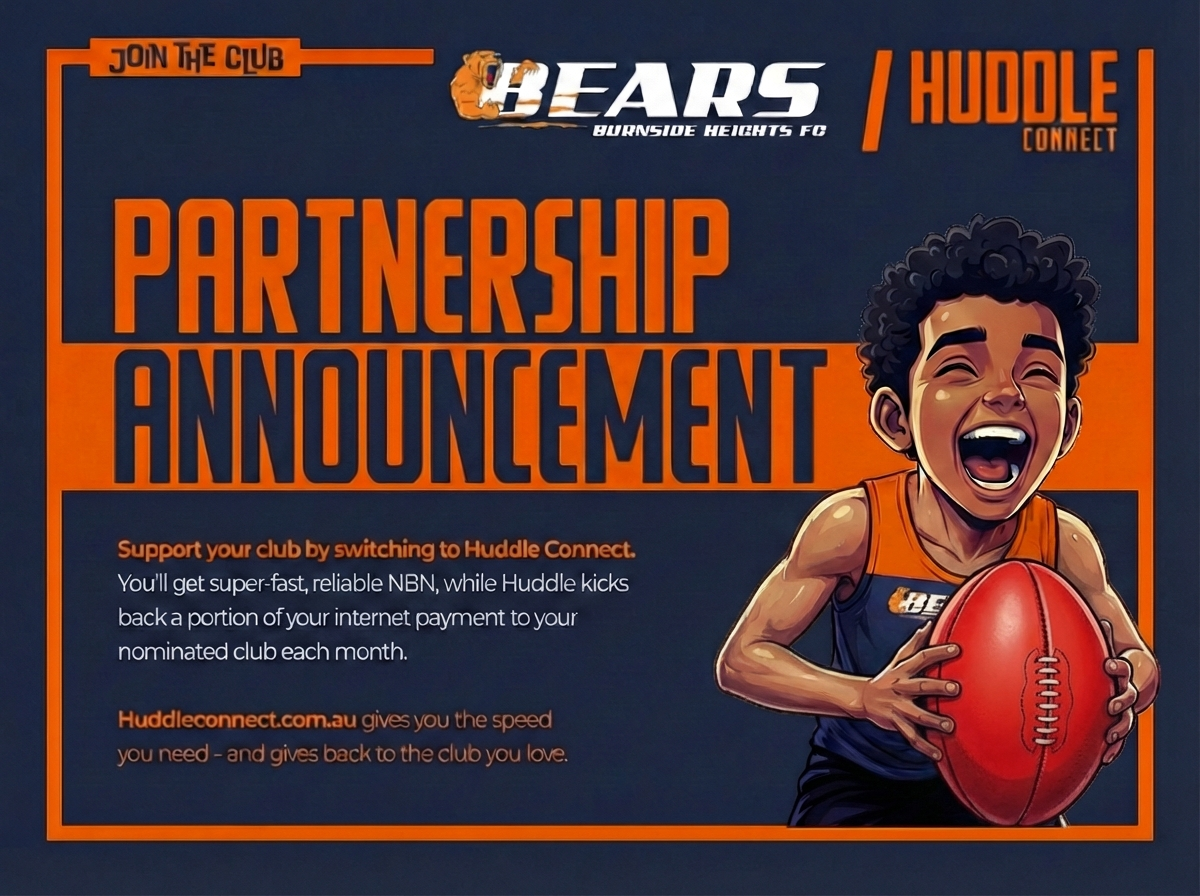 PARTNER ANNOUNCEMENT Att: Bears Family We've got something special to share — a simple way you can support our club every single month without spending an extra dollar. Here's how it works: Switch your home broadband to Huddle Connect and nominate Burnside Heights Football Club. That's it. Huddle will donate up to $5 per month from your account straight back to our club. No catch. No hidden costs. No lock-in contracts — just fast, reliable internet powered by BTB Australia, with direct connections to all your favourite platforms like Netflix, YouTube, Facebook, Apple and Amazon, plus 2,700 more. Huddle delivers fast, stable internet built for streaming, gaming and working from home. PLUS, THE KICK-OFF BONUS – APRIL 2026 ONLY Switch by the 31st March and Huddle will give our club a one-off $50 kick-back on your connection for April 2026. That's real money going straight into our club. Visit www.huddleconnect.com.au and nominate Burnside Heights Football Club when you sign up.